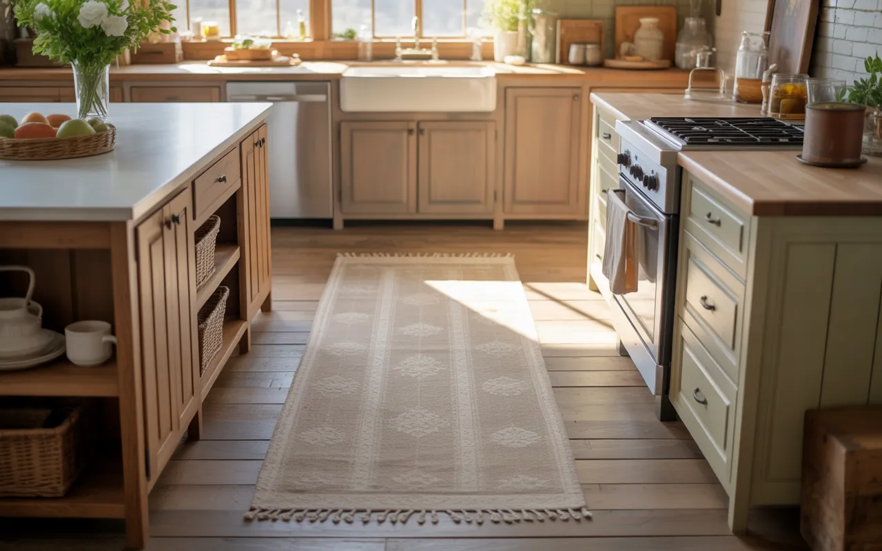 A soft neutral rug is one of the quickest ways to warm up a rustic kitchen for spring. Its gentle texture softens hard floors and adds a welcoming feeling to the entire room. This idea works especially well in narrow or galley kitchens where a runner can instantly anchor the space. Neutral tones like cream, beige, or soft taupe blend effortlessly with wood accents and spring greenery. I’ve noticed that a rug also helps break up large areas of flooring, making the kitchen feel more layered, comfortable, and lived-in.